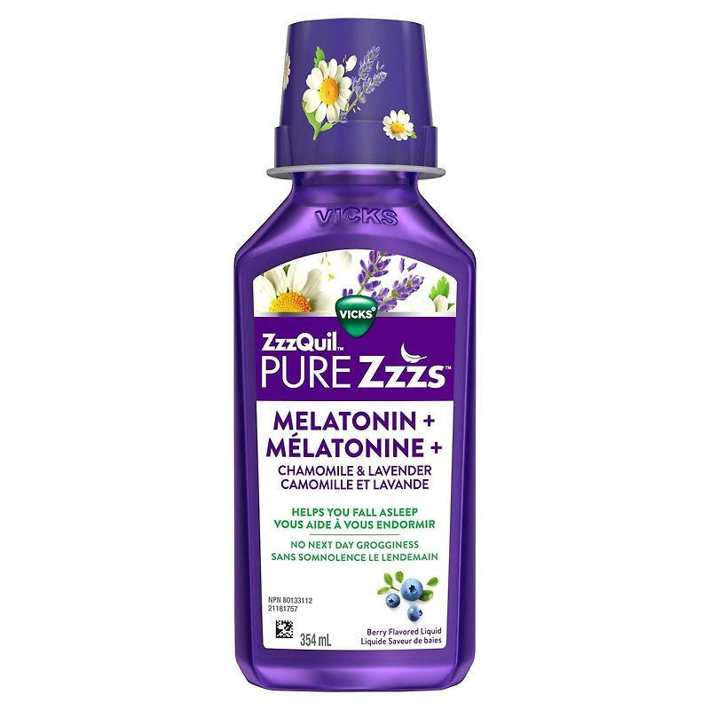 ZzzQuil PURE Zzzs Liquid Melatonin supports your body's sleep cycle. If you've been struggling with occasional sleeplessness consider trying melatonin. ZzzQuil PURE Zzzs Liquid Melatonin helps you fall asleep and wake refreshed. This melatonin liquid also contains a complementary blend of chamomile and lavender. ZzzQuil PURE Zzzs Liquid Melatonin was developed by the trusted experts at Vicks, from the World's #1 Sleep Aid Brand.† †Source Euromonitor International Limited; Consumer Health 2024 Edition; Sleep Aids, all channels, retail selling price, Global Brand Name ZzzQuil 2023 data