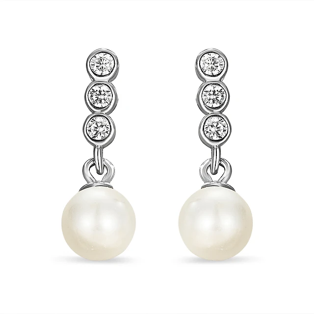 Stainless Steel Pearl Drop Earrings – 75mm. Color: white | Doucet Latendresse