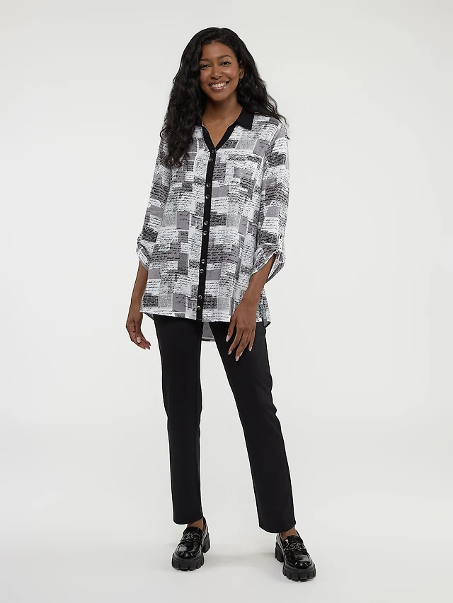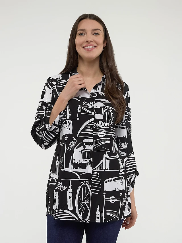 3/4-sleeve semi-fitted tunic length blouse with buttons