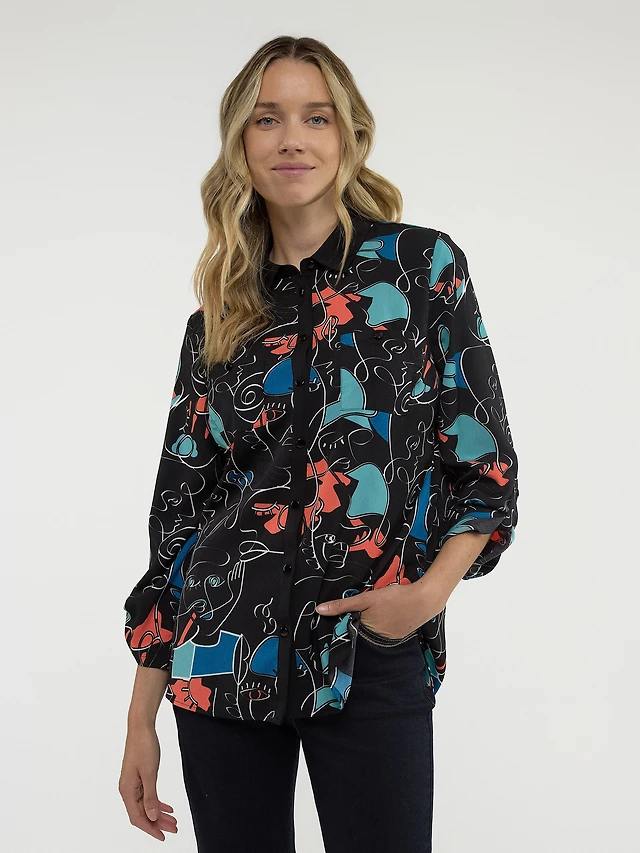 Long-sleeve tunic length blouse with buttons