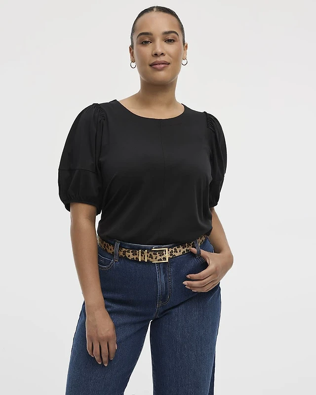 Short-Puffy-Sleeve Denim Top with Boat Neckline