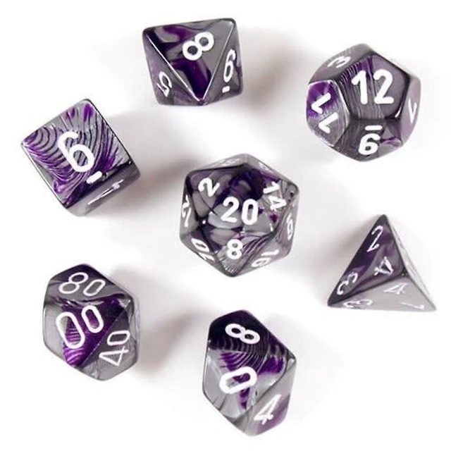 7 dés polyédriques Gemini violet/acier avec chiffres blancs