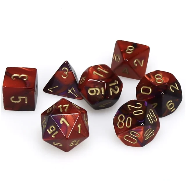 7 dés polyédriques Gemini violet/rouge avec chiffres dorés