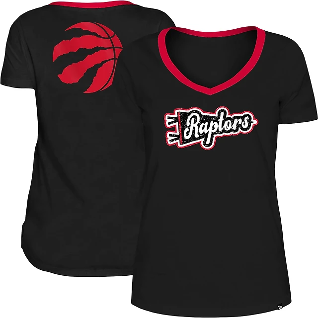 5th & Ocean by New Era - T-shirt à col en V avec fanion scintillant noir Toronto Raptors Game Day pour femme