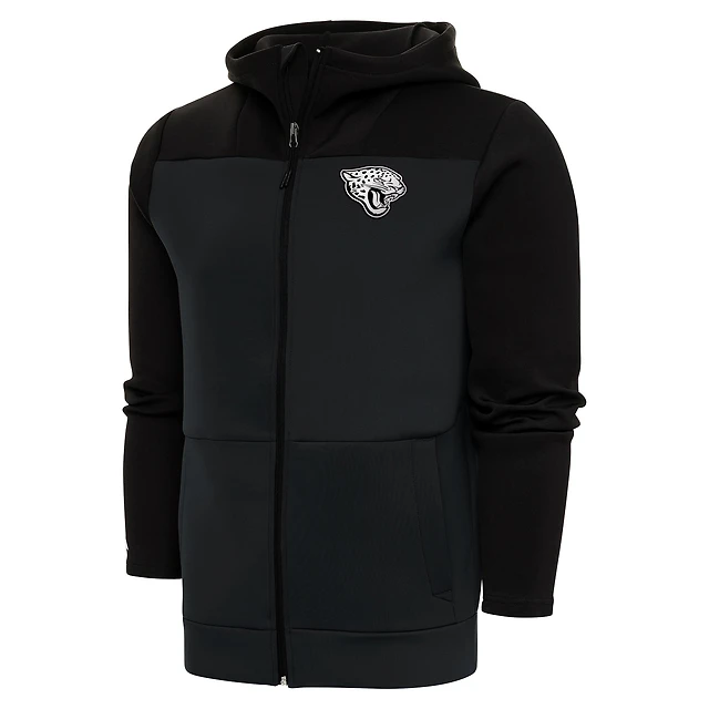 Sweat à capuche zippé intégral pour homme Antigua Charcoal/Black Jacksonville Jaguars avec logo métallique Protect