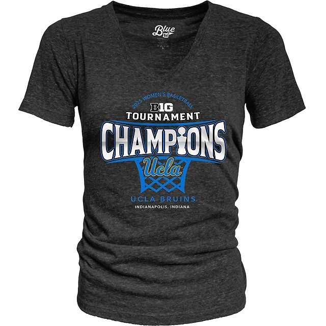 T-shirt à col en V bleu 84 noir pour femme UCLA Bruins Champions du tournoi de conférence basket-ball féminin Big Ten 2025 Locker Room Tri-Blend