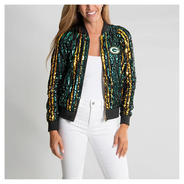 Veste bomber zippée à rayures et sequins pour femme Cuce Green des Bay Packers, coupe ajustée