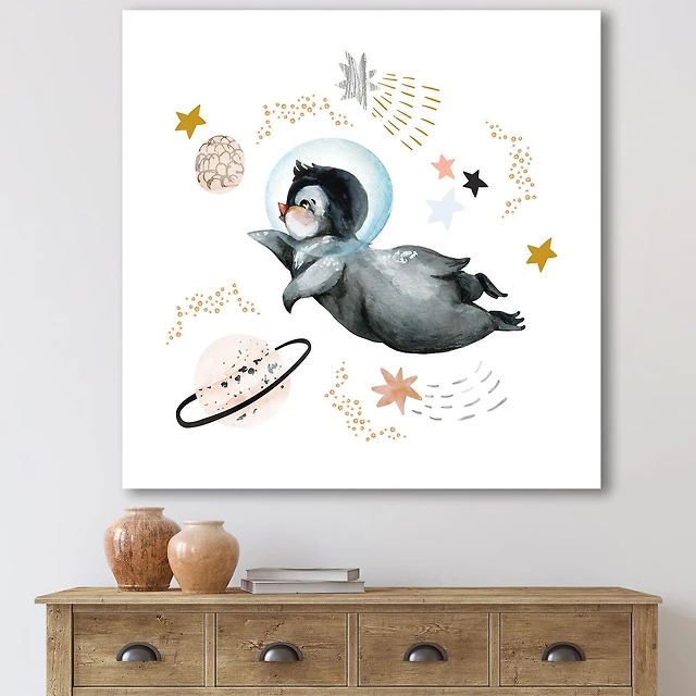 Designart Petit Pingouin Volant Étoiles et Planètes II Art mural sur toile