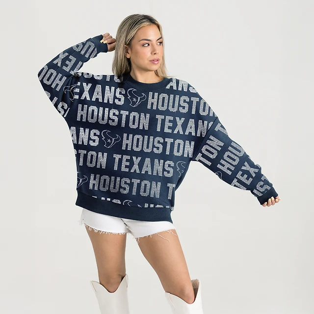 Sweat-shirt décontracté à épaules tombantes et texte strass Hype Era pour femme, bleu marine, motif Gameday Couture des Houston Texans