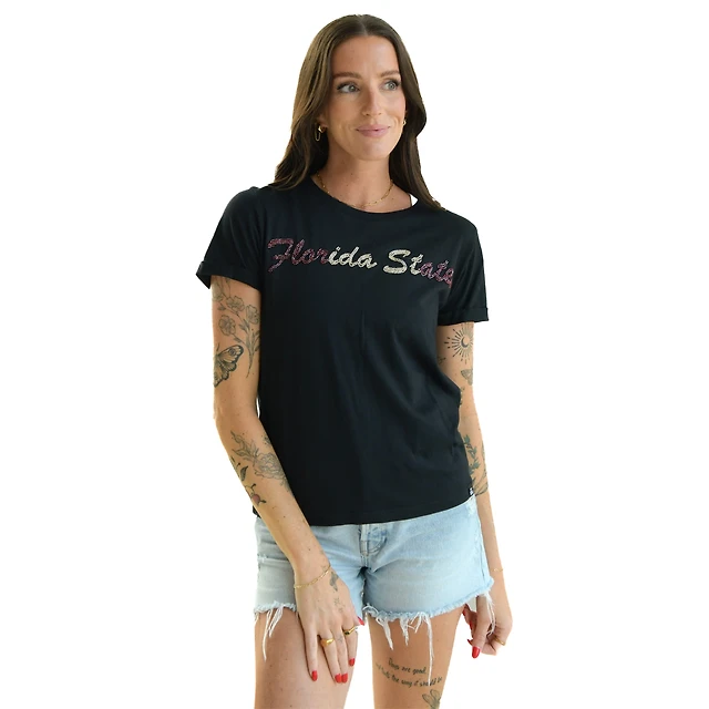 T-shirt noir pour femme avec inscription en perles cousues à la main Florida State Seminoles