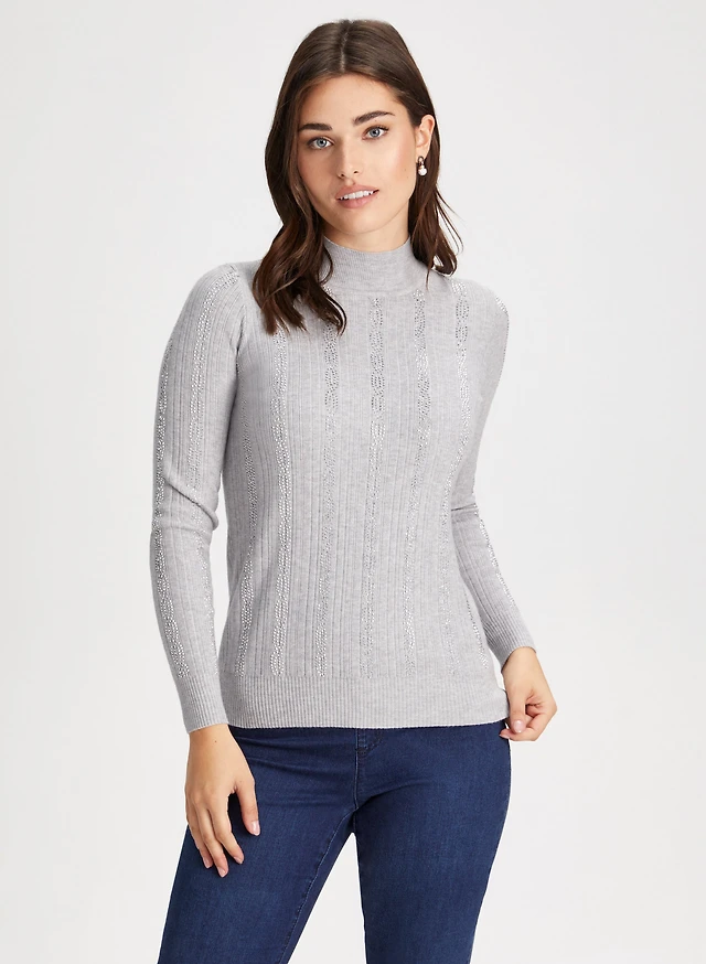 Pull ras-du-cou à perles et paillettes et jean à enfiler