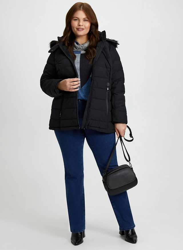 Manteau matelassé et jean bleu semi-évasé