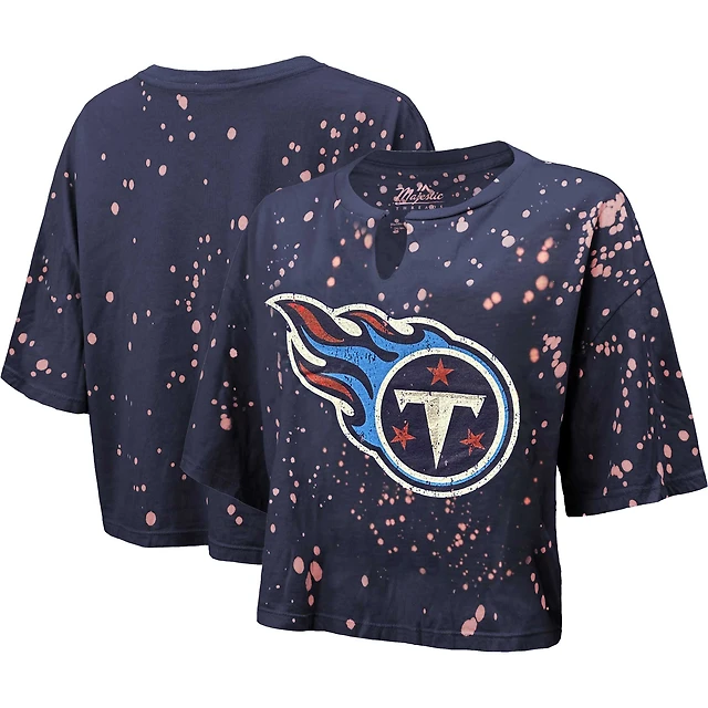 T-shirt court à col cranté Majestic Threads pour femmes, bleu marine, Tennessee Titans, Bleach Splatter