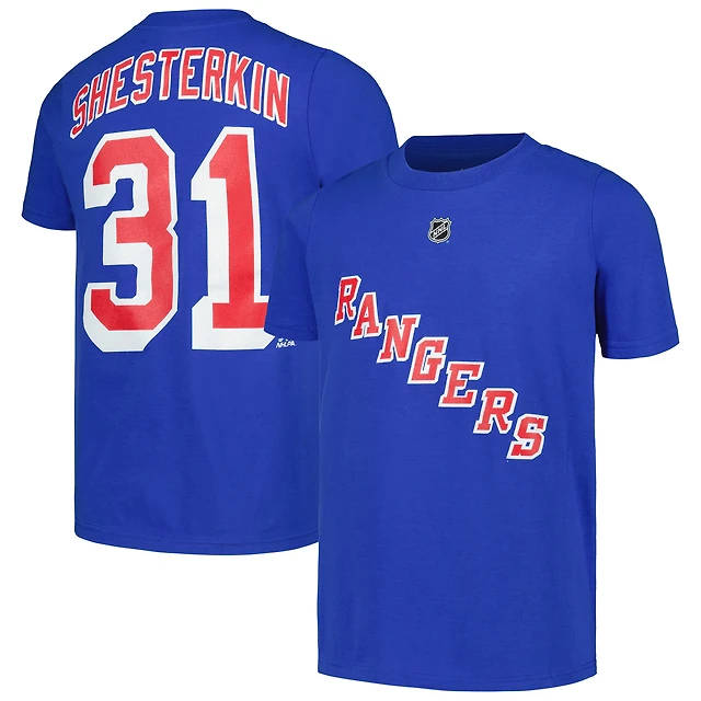 T-shirt bleu avec nom et numéro de joueur des Rangers New York Igor Shesterkin pour jeunes