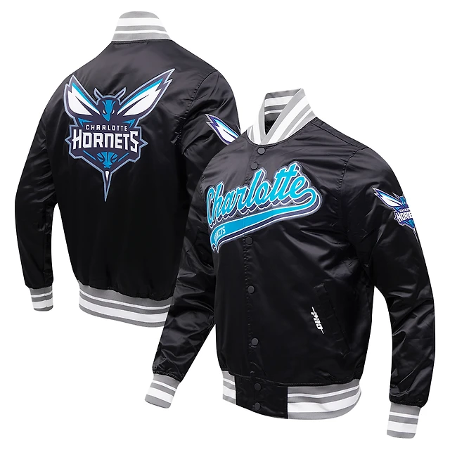 Veste universitaire en satin à boutons-pression complets Charlotte Hornets Script Tail Pro Standard pour hommes, noire