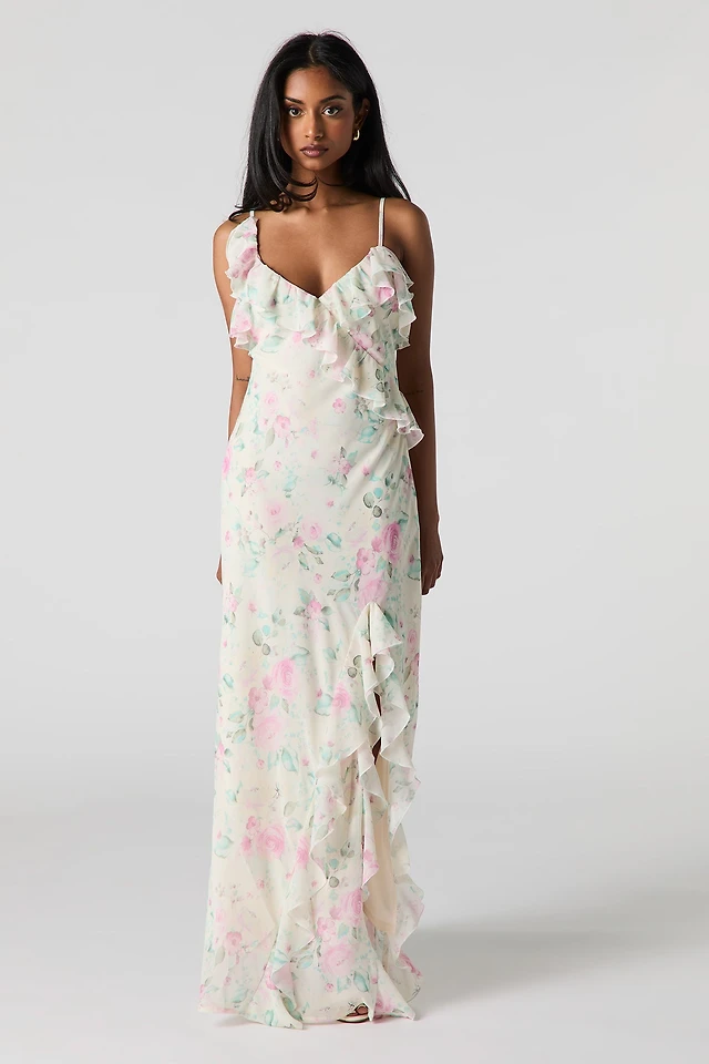Robe midi en mousseline boutonnée à l'avant avec manche bouffante