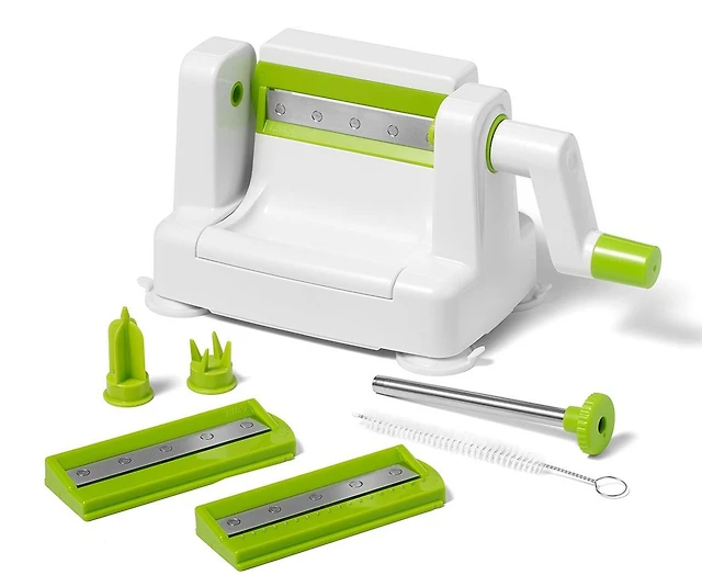 Starfrit Coupe-Spirales Repliable, 3 Lames Amovibles, Coupe-Légumes Compact, Base Antidérapante, Plateau Sécuritaire, Rangement Facile, Va au Lave-Vaisselle, Créez des Spirales Santé Facilement