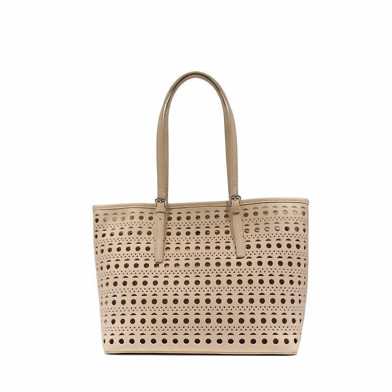 Ajoutez une touche d’élégance moderne à votre tenue avec ce magnifique sac fourre-tout signé Miss Caprice. Son design ajouré composé de motifs géométriques délicatement perforés lui confère un style à la fois tendance et raffiné, tout en offrant une allure légère parfaite pour la saison.