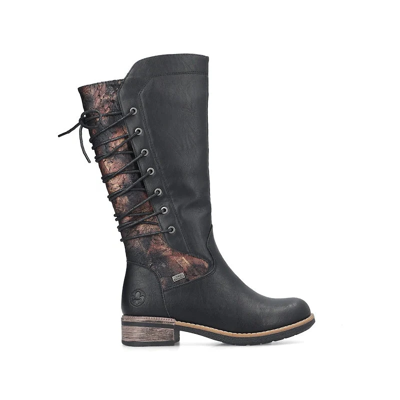 Confortables et élégantes – le combo parfait ! Vous ne voudrez plus enlever ces bottes hautes Rieker en noir. L’ingénieuse combinaison de lacets et de fermeture éclair offre un maintien optimal et permet de les enfiler et retirer facilement. La semelle adhérente assure une bonne traction en tout temps. La doublure chaude et duveteuse offre une protection durable contre le froid, et la tige déperlante protège efficacement de l’humidité et du vent. De quoi affronter les journées froides avec style !