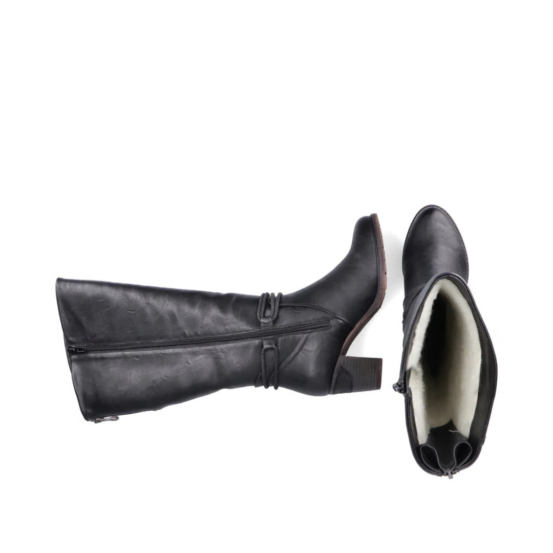 Style ET confort : il n'y a pas de « ou » ! Ces bottes hautes Rieker noires sont non seulement ultra-tendance, mais elles protègent aussi vos pieds du froid. La fermeture éclair permet un enfilage ultra-rapide. Le cordon tendance apporte une finition parfaite et un look original. La semelle adhérente à talon bloc assure un bon maintien. La tige Vario assure une largeur de tige personnalisée. La doublure douce et chaude fait de ces bottes les compagnons parfaits, où et quand ! Un potentiel de chaussures 100 % coup de cœur !