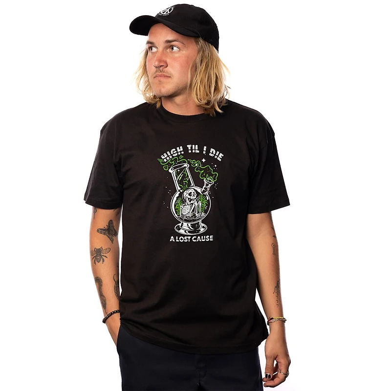 Un t-shirt streetwear avec du caractère. Arborez cet imprimé sérigraphié détaillé mettant en scène une bong stylisée et un crâne entouré de volutes, accompagné du message « HIGH TIL I DIE » et « A LOST CAUSE » pour un look qui ne passe pas inaperçu. Coupe classique, 100% coton de qualité, parfait pour affirmer votre style urbain.