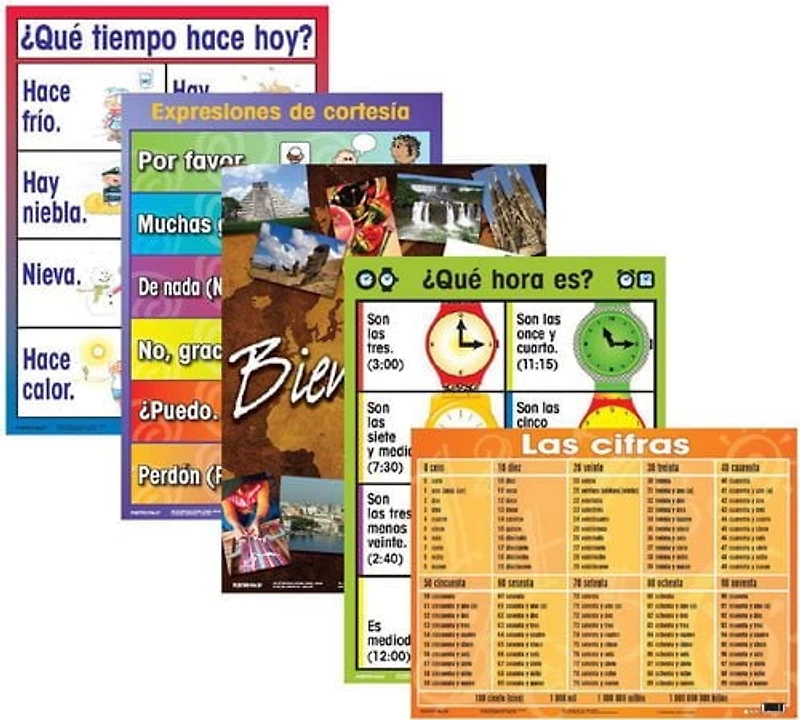 Comprend tous les cinq affiches. Chaque 18 "x 24" Affiches: -¿Qué tiempo hace hoy? -Expresions de cortesía -Bienvenidos -¿Qué hora es? -Las cifras