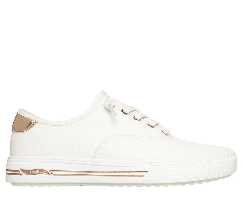 Meet the street in well-cushioned comfort and classic style with Skechers Street™ Arch Fit® Arcade - Vista Views. This vegan fashion sneaker has been granted the APMA Seal of Acceptance and features a round-toe canvas upper with tied-off stretch laces, a shock-absorbing Arch Fit® insole, and a lightweight cushioned midsole.