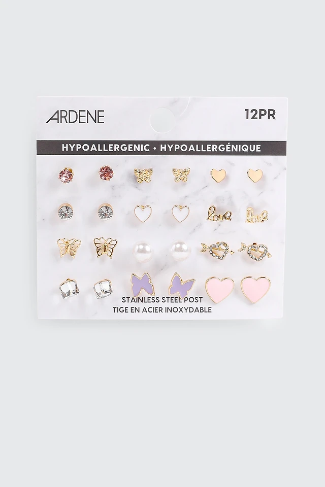 Ardene 12-Pack of Heart & Butterfly Earrings in Gold | Stainless Steel