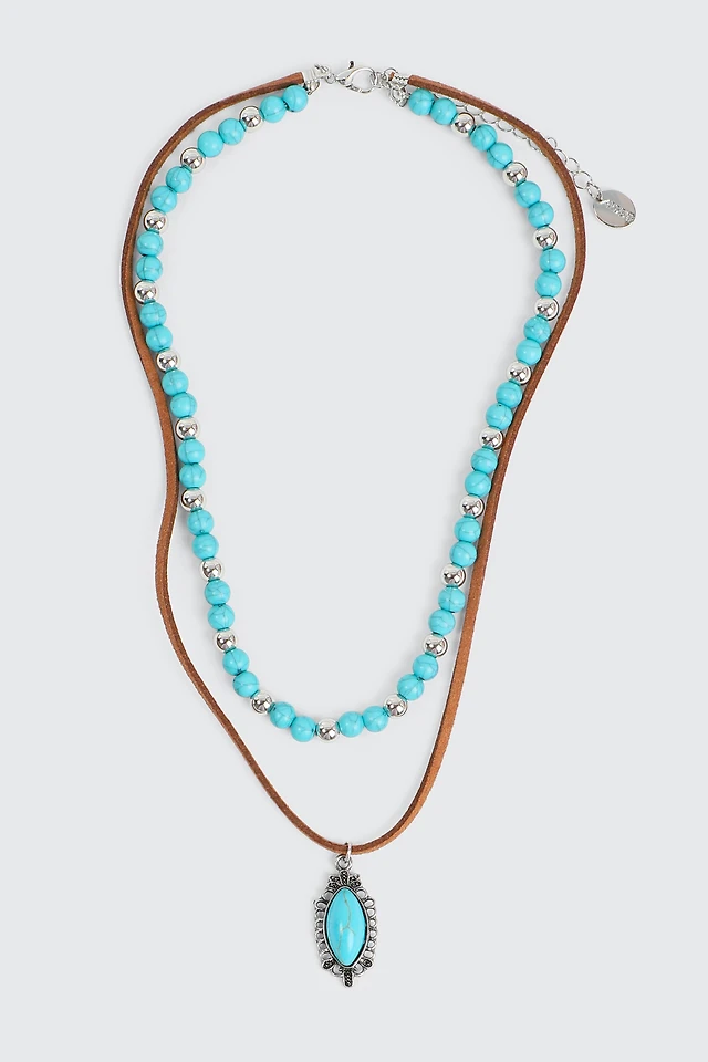 Ardene 2-Row Bead & Cord Necklace with Turquoise Stone in Medium Green