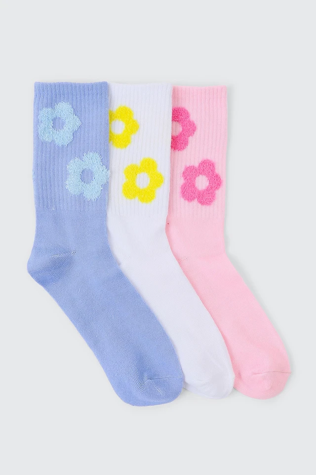 Ardene 3-Pack of Crew Socks with Fuzzy Daisies in Medium Blue | Polyester/Spandex