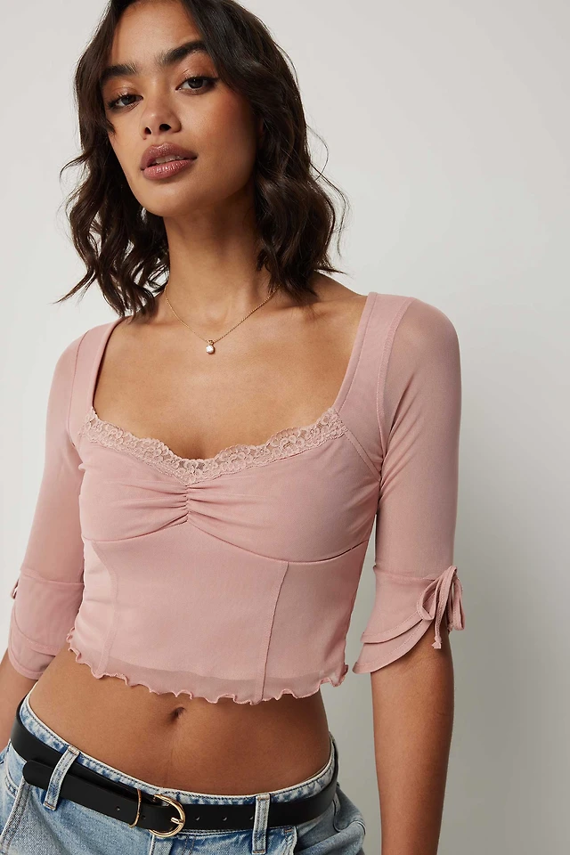 Ardene 3/4 Sleeve Mesh Bustier Top in Light Pink | Size Large | Polyester/Elastane