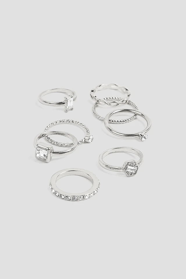 Ardene 8-Pack Thin Rings with Stone Embellishment in Silver | Size Small