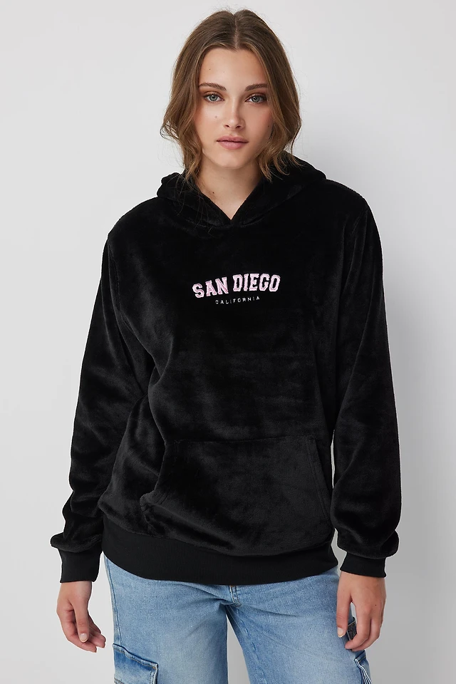 Ardene American City Faux Fur Hoodie in Black | Size XS | Polyester