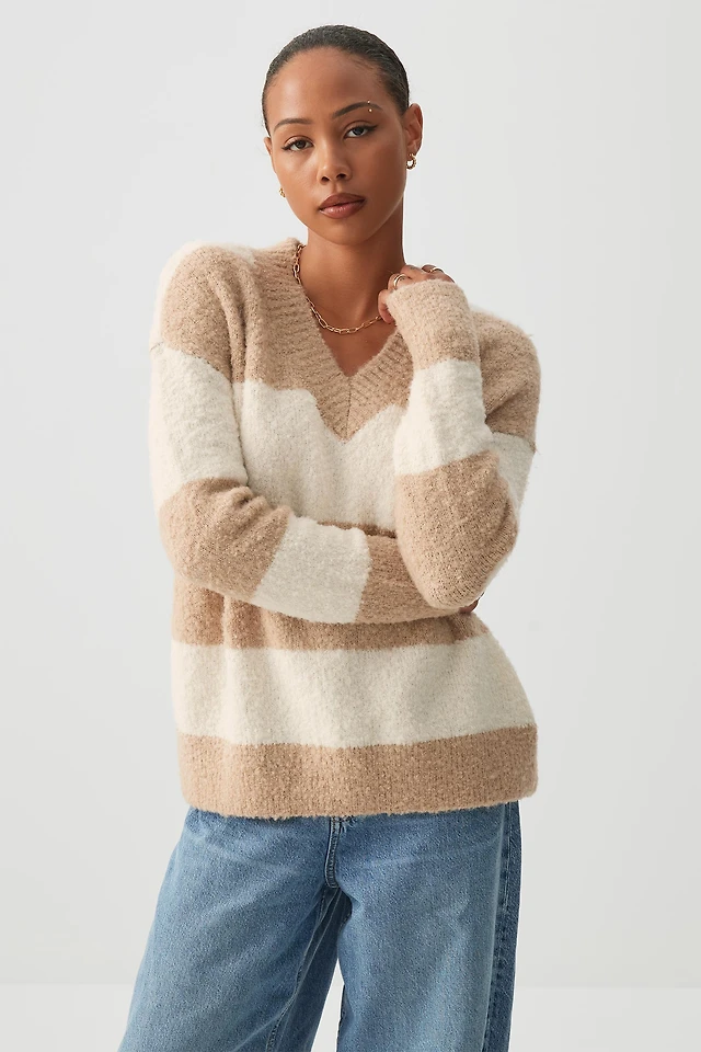 Ardene Boucle Oversized V-Neck Sweater in Beige | Size | Polyester/Elastane