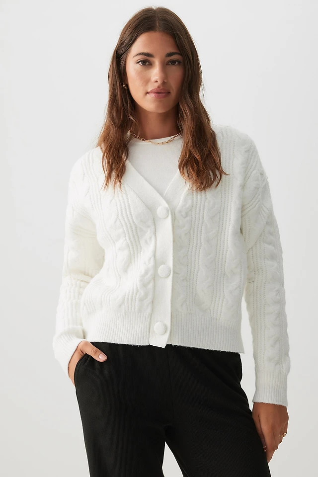 Ardene Cable Knit V-Neck Cardigan in Off-White | Size | Polyester | Eco-Conscious