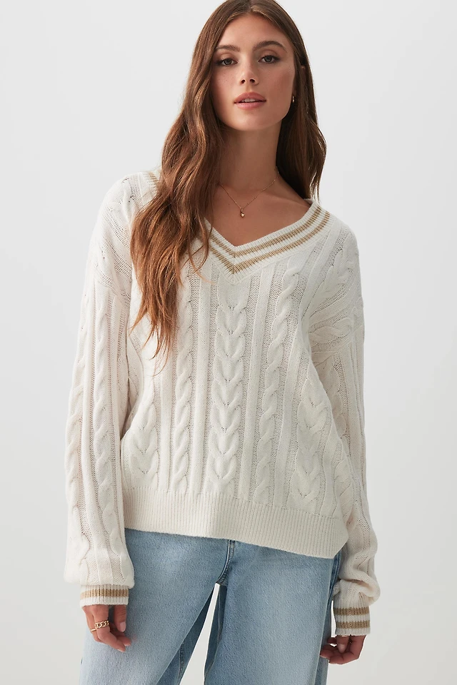 Ardene Cable Knit V-Neck Sweater in Off-White | Size | 100% Acrylic