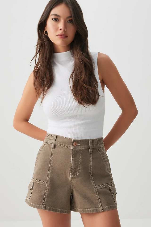 Ardene Contrast Stitch High Rise Midi Shorts in Beige | Size Large | Polyester/Spandex/Cotton
