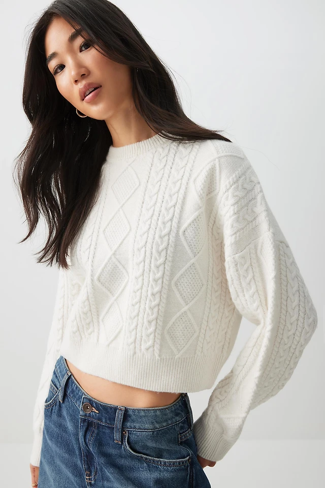 Ardene Crop Cable Knit Sweater in Off-White | Size | Polyester | Eco-Conscious