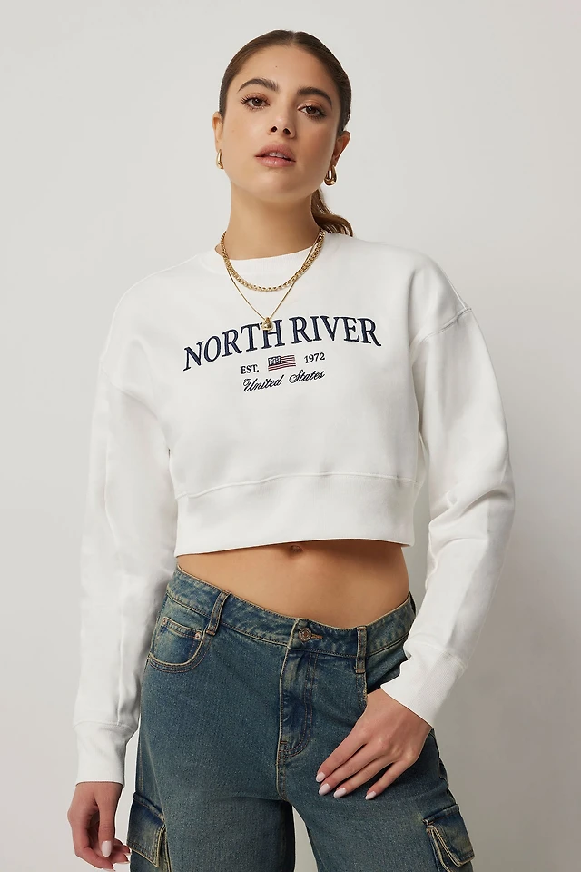 Ardene Crop Destination Sweatshirt in White | Size | Polyester/Cotton | Fleece-Lined