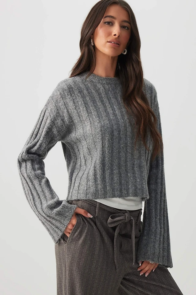 Ardene Crop Fuzzy Rib Crew Neck Sweater in Dark Grey | Size Small | Polyester