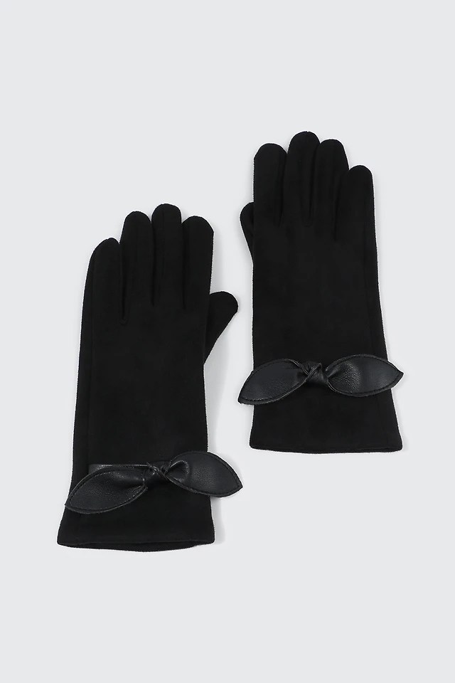 Ardene Faux Suede Gloves with Bow in Black | Faux Leather/Polyester/Faux Suede