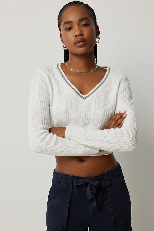 Ardene Fitted Cable Knit Sweater in White | Size Medium | Polyester/Nylon