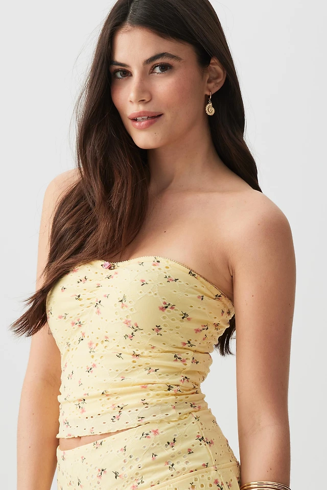 Ardene Floral Eyelet Tube Top in Light Yellow | Size | Polyester/Spandex