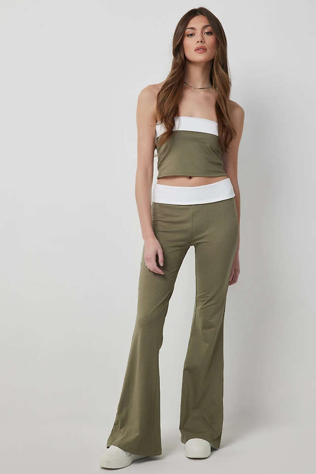 Ardene Foldover Flare Leggings in Khaki | Size Medium | Spandex/Cotton