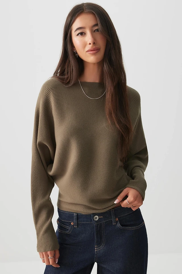 Ardene Horizontal Rib Dolman Sweater in Khaki | Size | Polyester/Rayon/Nylon
