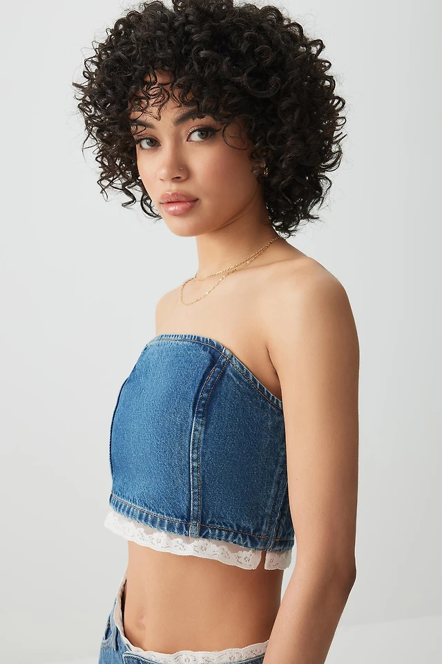 Ardene Lace Trim Denim Tube Top in Medium Blue | Size | 100% Cotton