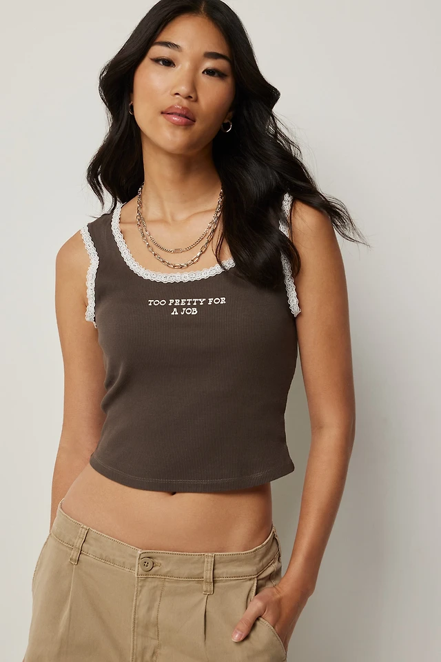 Ardene Lace Trim Tank Top in Brown | Size | 100% Cotton