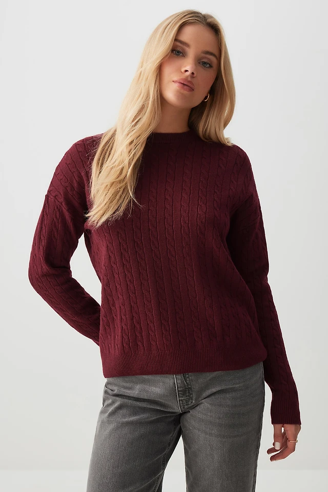 Ardene Long Cable Knit Sweater in Burgundy | Size Large | Polyester/Nylon