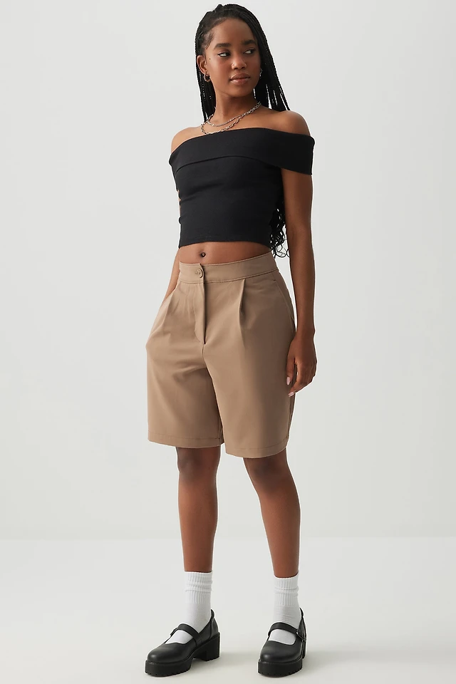 Ardene Mid Rise Bermuda Tailored Shorts in Beige | Size | Polyester/Spandex/Viscose