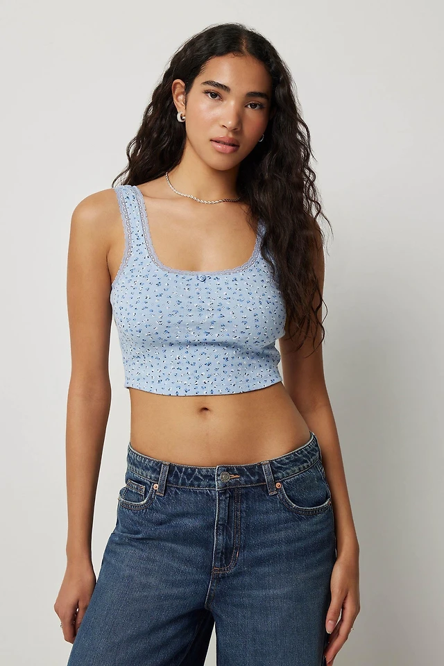 Ardene Pointelle Lace Trim Tank in Light Blue | Size | 100% Cotton